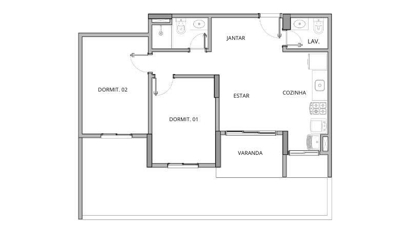 Unidade com 2 dormitórios, 1 banheiro e 1 lavabo.