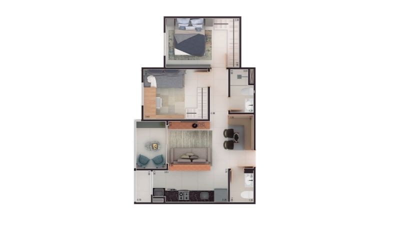 Unidade com 2 dormitórios, 1 banheiro e 1 lavabo.