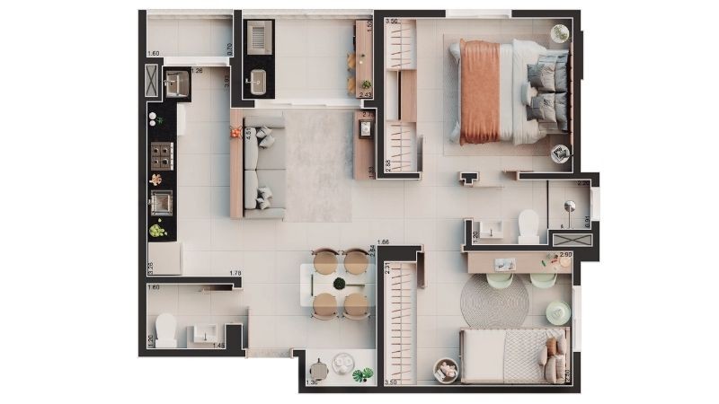 Unidade com 2 dormitórios, 1 banheiro e 1 lavabo.